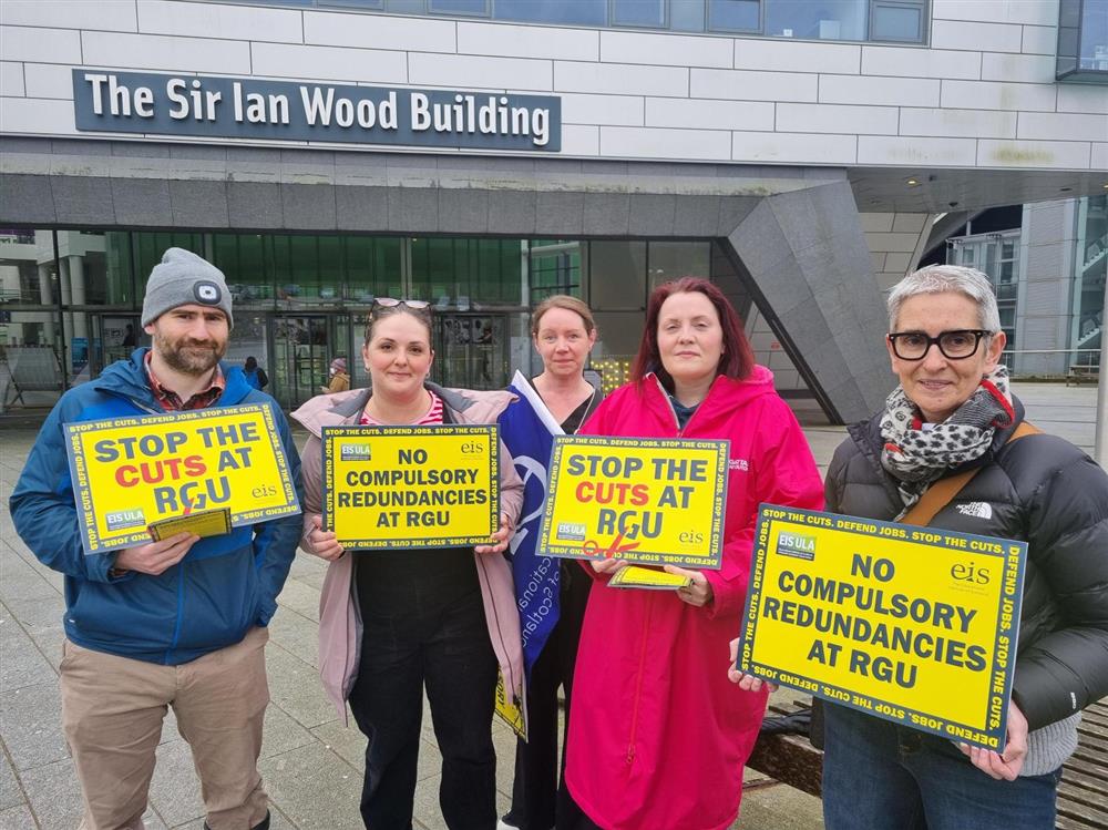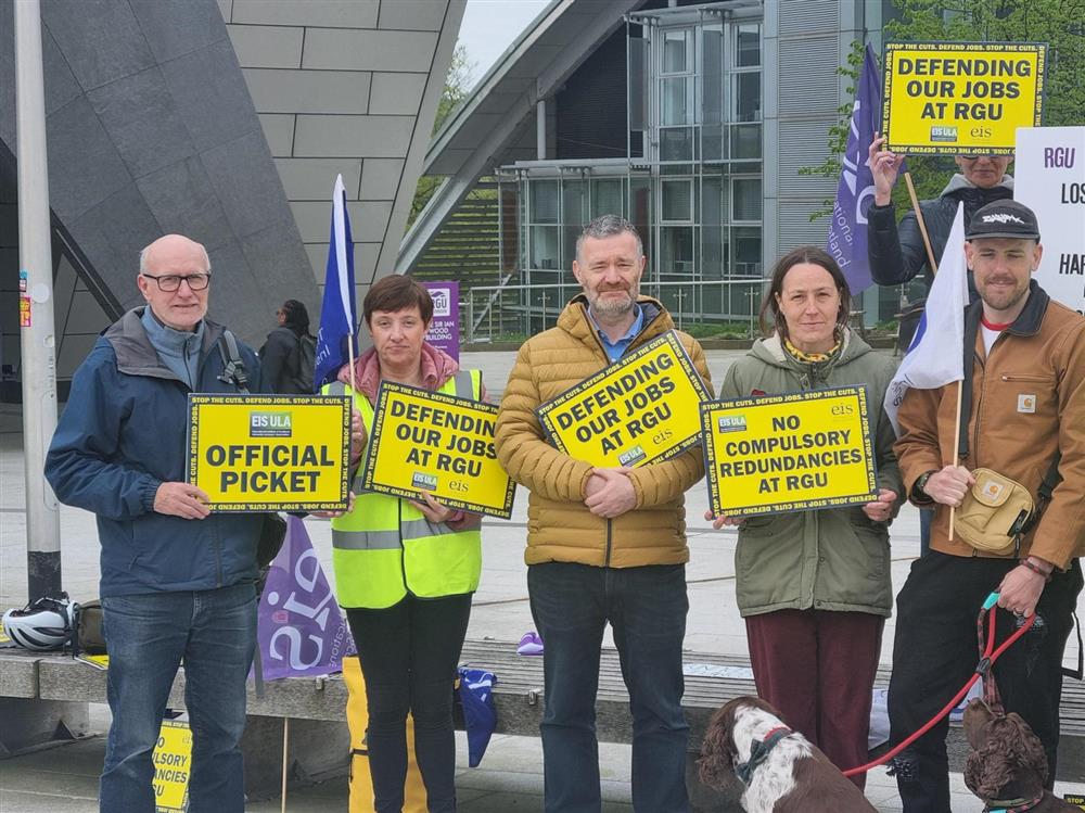 Lecturing staff at RGU have begun their first day of strike action in a determined effort to protect jobs, stand up for quality education and oppose compulsory redundancies.